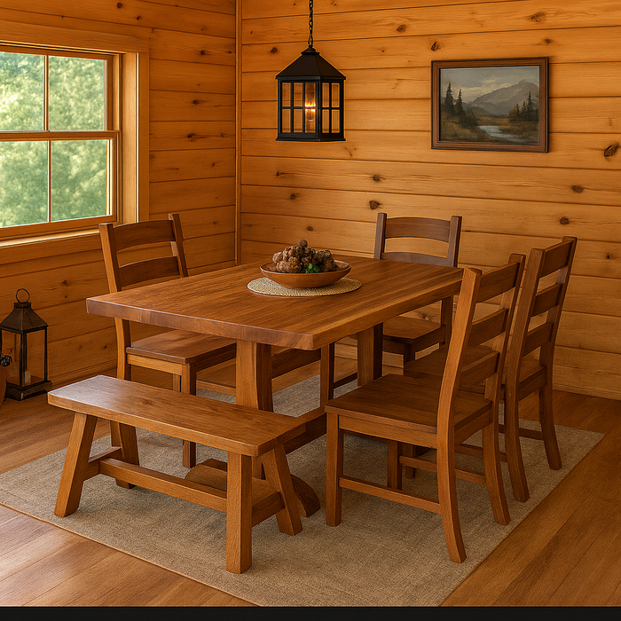 The Black Walnut Trestle Dining Package includes a 42" x 60" handcrafted Live Edge Black Walnut Trestle Table, four matching Black Walnut Amish-made Chairs, and a 4' Black Walnut Bench. Built with timeless Amish craftsmanship, this set combines rustic elegance and lasting durability—perfect for family dining and cabin gatherings.